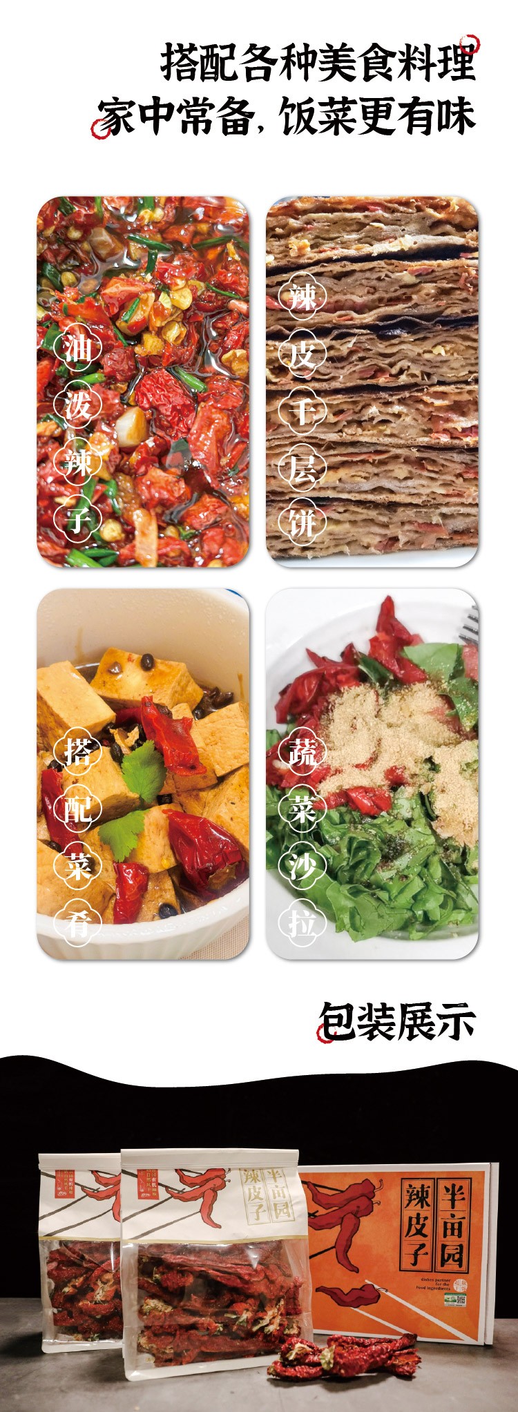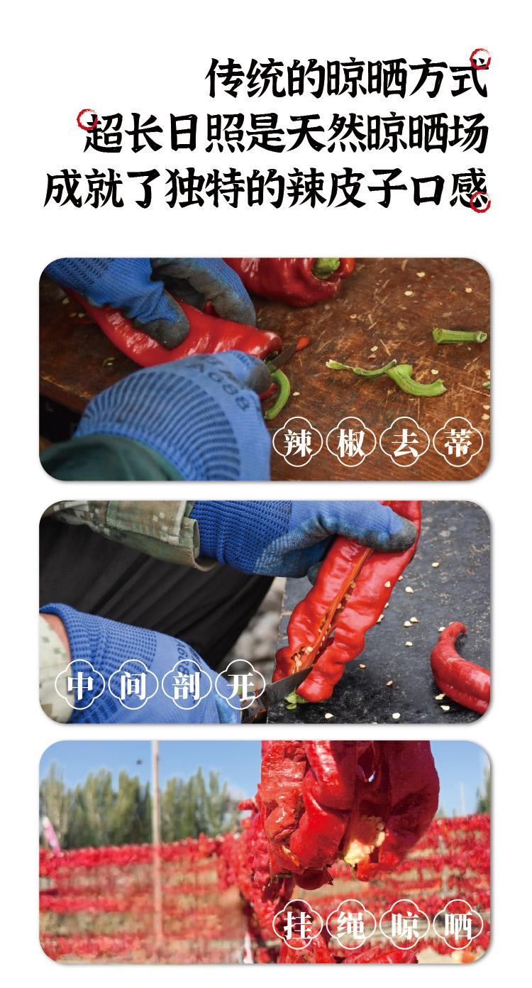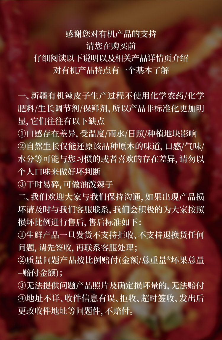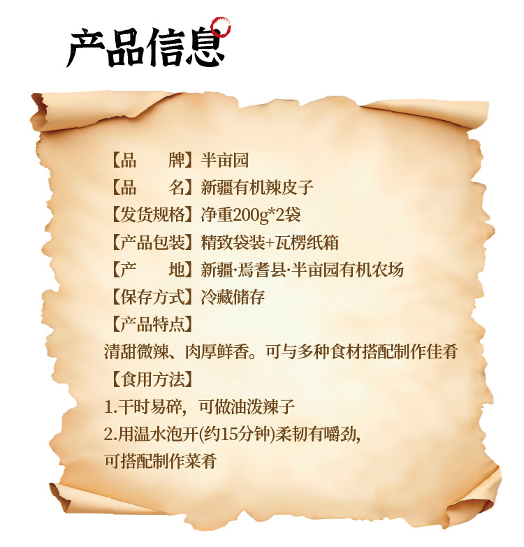 【品 名】半亩园新疆有机辣皮子 【发货规格】净重200g*2袋 【产品包装】精致袋装+瓦楞纸箱 【产 地】新疆·焉耆县·半亩园有机农场【保存方式】阴凉通风处储存 【产品特点】清甜微辣、肉厚鲜香。可与多种食材搭配制作佳肴; 【食用方法】 1、干时易碎,可做油泼辣子 2、用温水泡开(约30分钟)柔韧有嚼劲,可搭配制作菜肴 【温馨提示】收到货后辣皮子有轻微破碎属于正常现象,介意者慎拍。请您收到货品后尽快开箱验货,如有破损请在24小时内反馈申请赔付,提交订单时请您仔细检查收件信息,因地址不清、电话错误导致的疑难件损失由买家自行承担。 所有评价(0)
