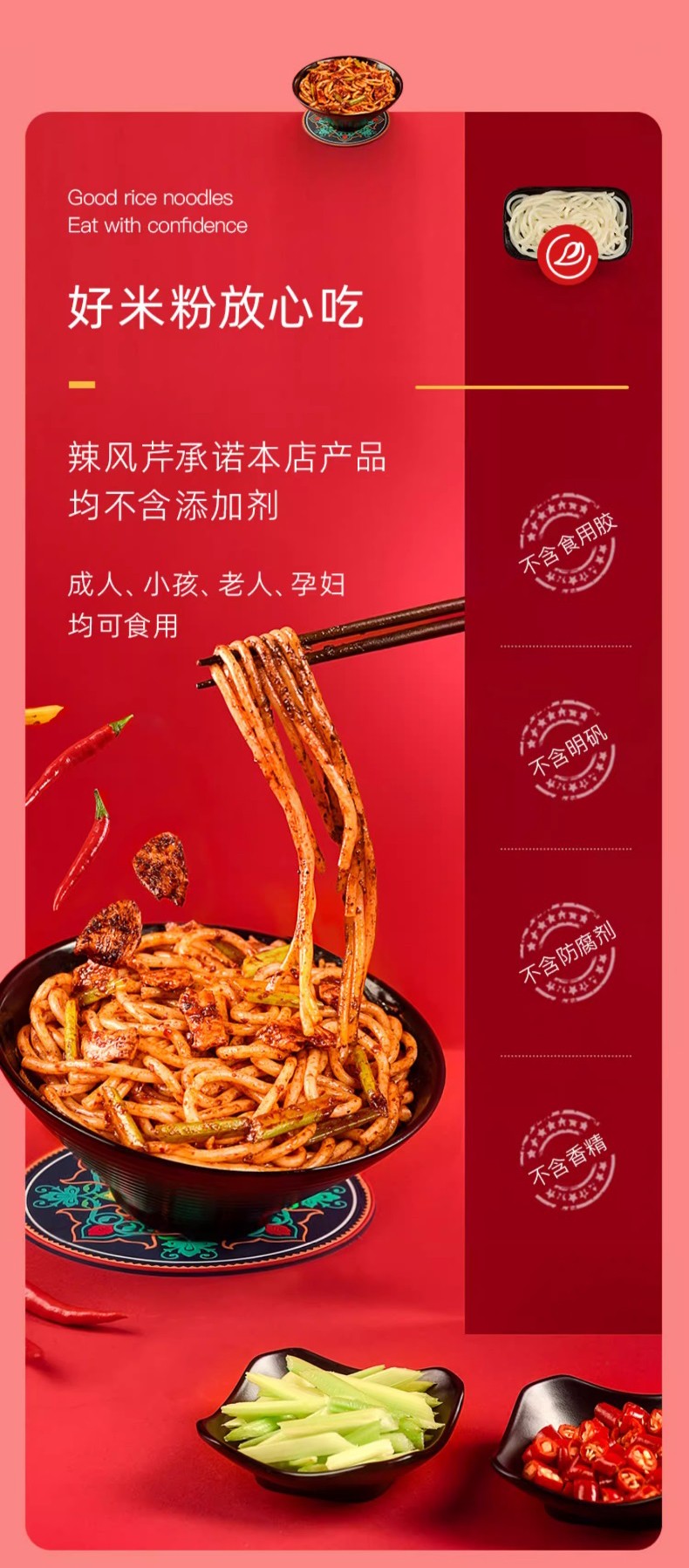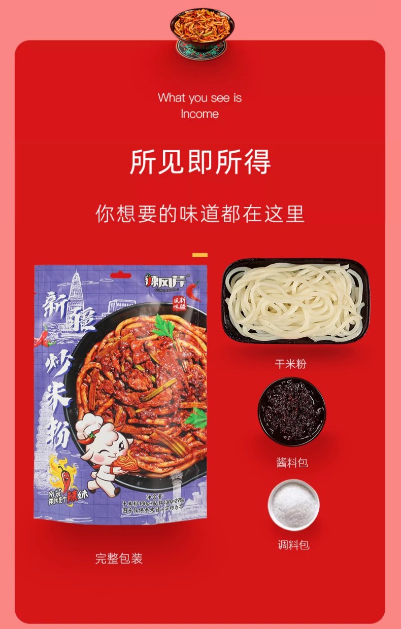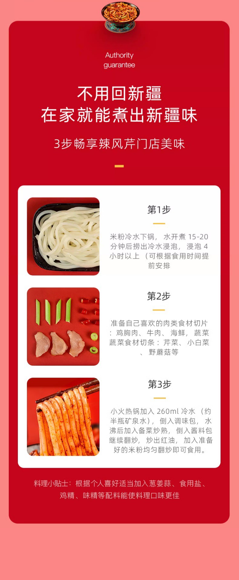 【商品名称】新疆辣风芹炒米粉中辣 【规格】 ①中辣290g/袋(干米粉160g+辣椒酱130g) ②微辣220g/袋(干米粉160g+辣椒酱50g) 【贮藏条件】请置于阴凉干燥处 【保质期】12个月 所有评价(0)